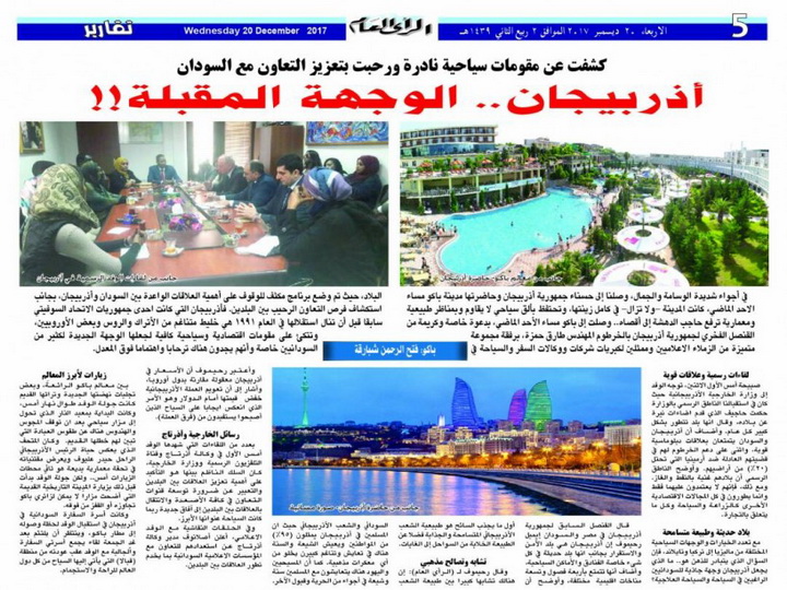 Журналист Фатх ар-Рахман Шабарига, побывавший в Азербайджане вместе с представителями медиа и туристического сектора Судана, поделился с читателями впечатлениями о нашей стране. В статье, опубликованной в имеющей широкую читательскую аудиторию 1news.az »