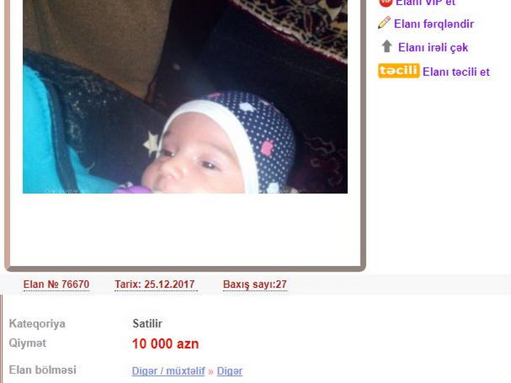 Сегодня социальные сети Азербайджана шокировала информация о том, что житель страны на сайте объявлений выставил на продажу своего ребенка за 10 тысяч манатов. Как сообщает 1news.az со ссылкой на